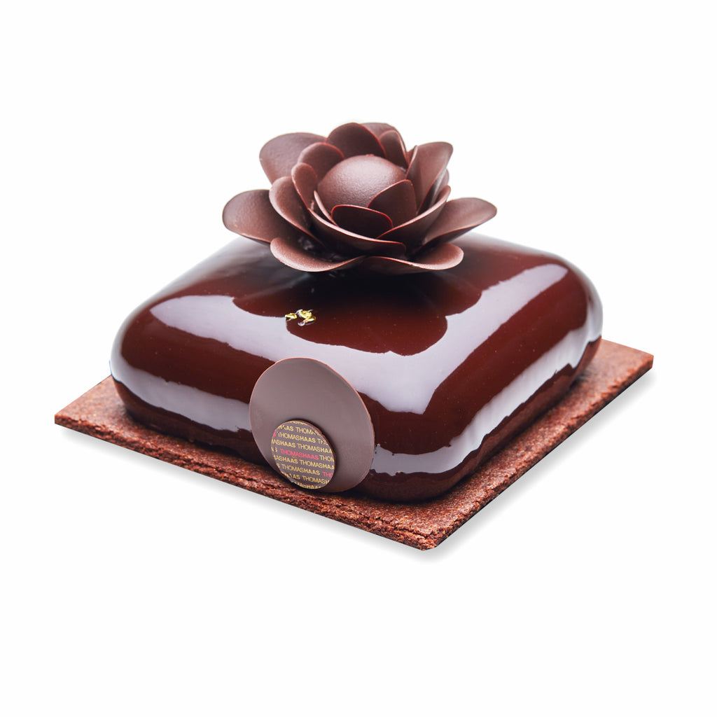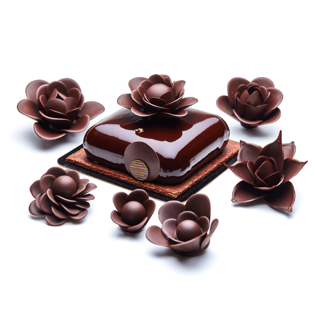 Our Blak “Classic” features 4 different textures composed of 69.3% dark chocolate almond cake, dark chocolate mousse, pot de crème and a dark chocolate shortbread “Breton” adorned with a multi-petal dark chocolate flower.