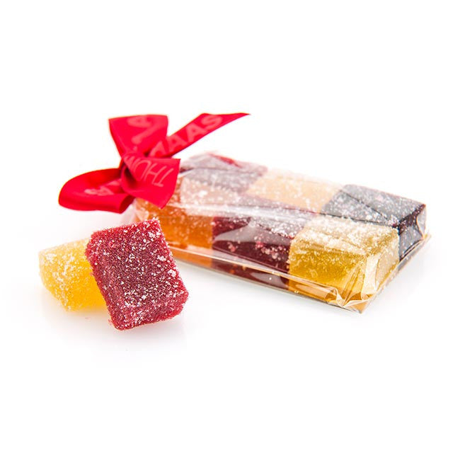 Our delicious fruit gelées (pâte de fruit) are prepared with the finest and freshest fruits and purees. A gentle cooking process and the use of natural apple pectin and lemons gives them their delicate texture. Slightly dipped in sugar but never too sweet, they make a perfect little treat at tea time or dessert!