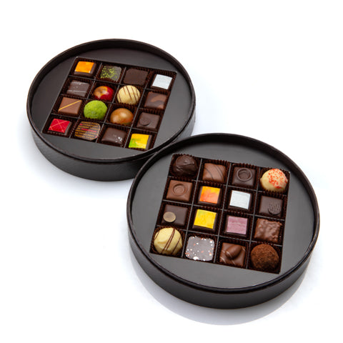 Round Gift Box filled with 48 handmade chocolates and truffles. We hand select the freshest assortment from our daily production.